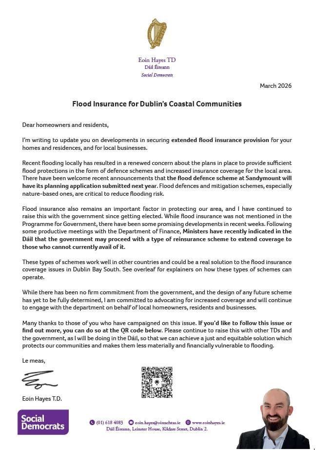 It’s an encouraging development, but by no means a guarantee, which is why I’m continuing to press the government on this issue, and will continue to engage Minister Troy and raise it at every available opportunity until Dublin Bay South has the flood insurance coverage it needs and deserves.